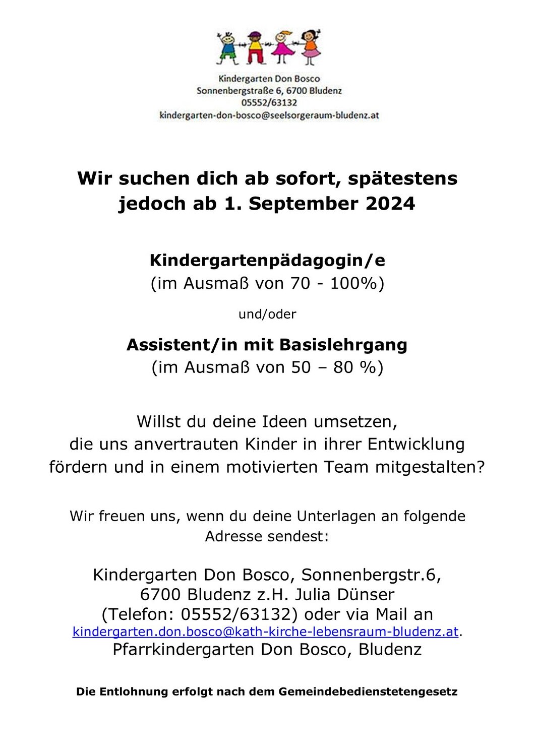 Der Pfarrkindergarten Don Bosco sucht ab sofort Verstärkung im Kindergarten