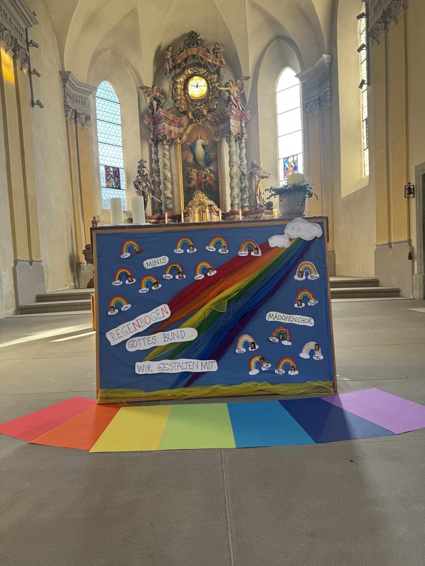 Nach einem Probejahr durften sie nun offiziell ihren Einsatz beginnen und bereicherten die Aufnahmefeier mit Texten, Fürbitten und Liedern unter dem Symbol des Regenbogens. Dieses biblische Zeichen, das seit Noah die Versöhnung zwischen Himmel und Erde ausdrückt, stand im Mittelpunkt des Gottesdienstes. Die sieben Farben des Regenbogens erinnern uns an den Bund Gottes mit den Menschen: Wer sich unter den leuchtenden Bogen stellt, kann sich immer wieder versöhnen und so kann das Miteinander gelingen.