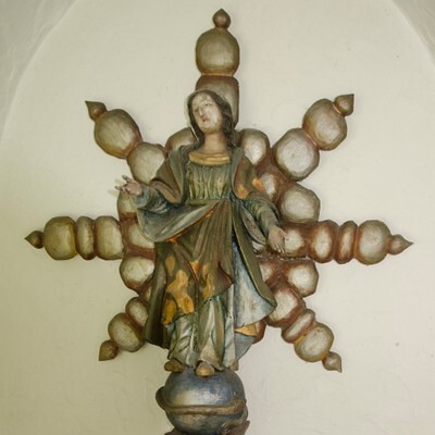 In dieser Nische ist auf einem siebenteiligen Strahlenkreuz eine alte geschnitzte Marienfigur befestigt - die Gottesmutter in geschwungener Kleidung, aus der man früher offensichtlich im Volksglauben Späne herunterschnitt. Maria steht auf einer blauen Weltkugel mit der Schlange; die Hände Mariens sind ausgebreitet, wahrscheinlich trug sie früher ein Szepter in ihrer Rechten.