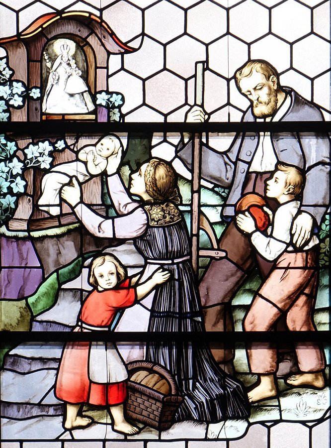 Bildstein, Wallfahrtskirche zu Unserer Lieben Frau Maria Heimsuchung, Detail aus Wir ziehen zur Mutter der Gnade, Bregenzerwälder Tracht, Juppe und Spitzkappe, Stifter Heinrich Schneider Höchst 1941
