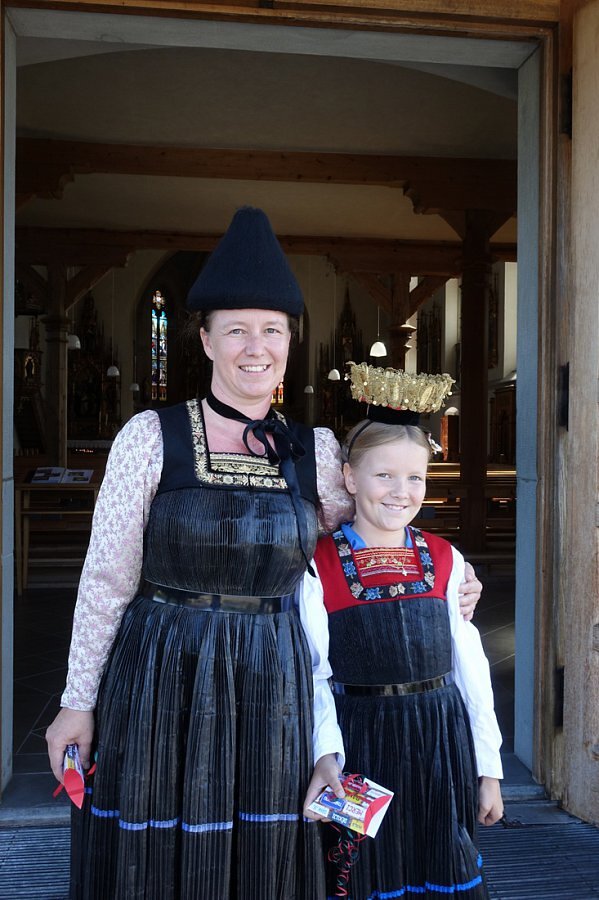 Bregenzerwälderinnen in Tracht mit Juppe und Spitzkappe, Flitterkrone zum Kirchgang, Egg 2014